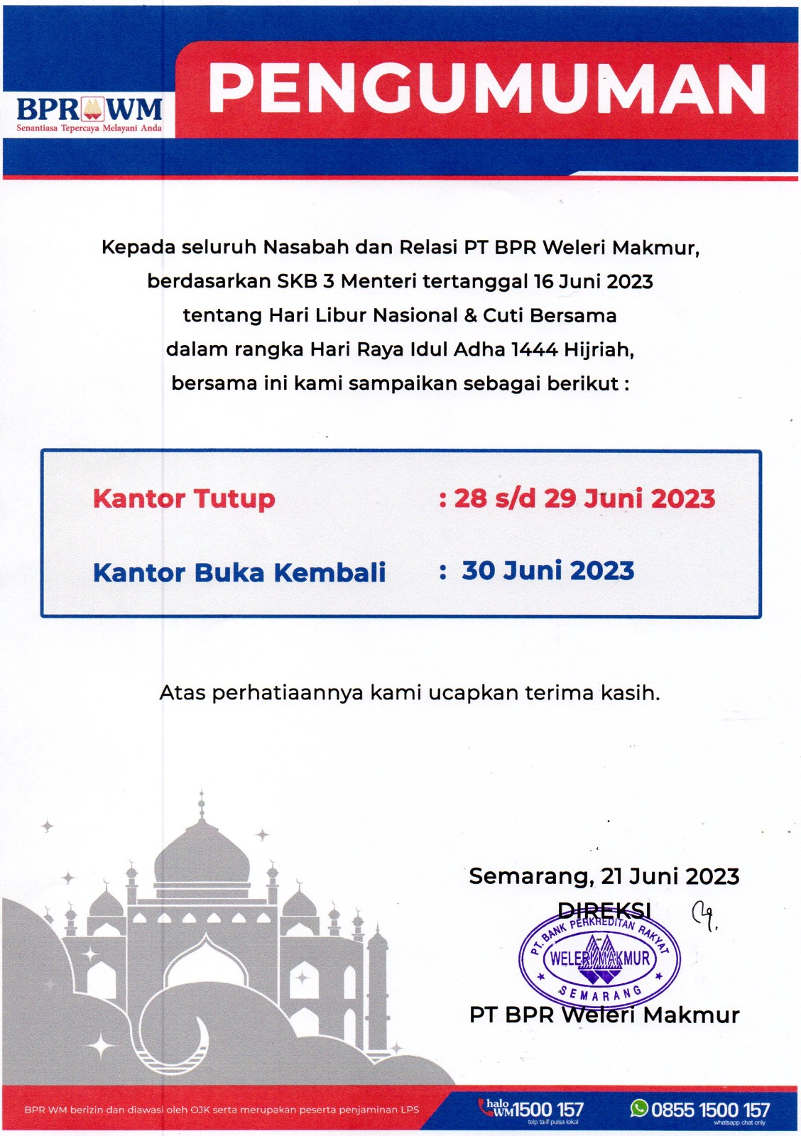 Pengumuman Tutup Kantor Dalam Rangka Hari Raya Idul Adha 1444 H