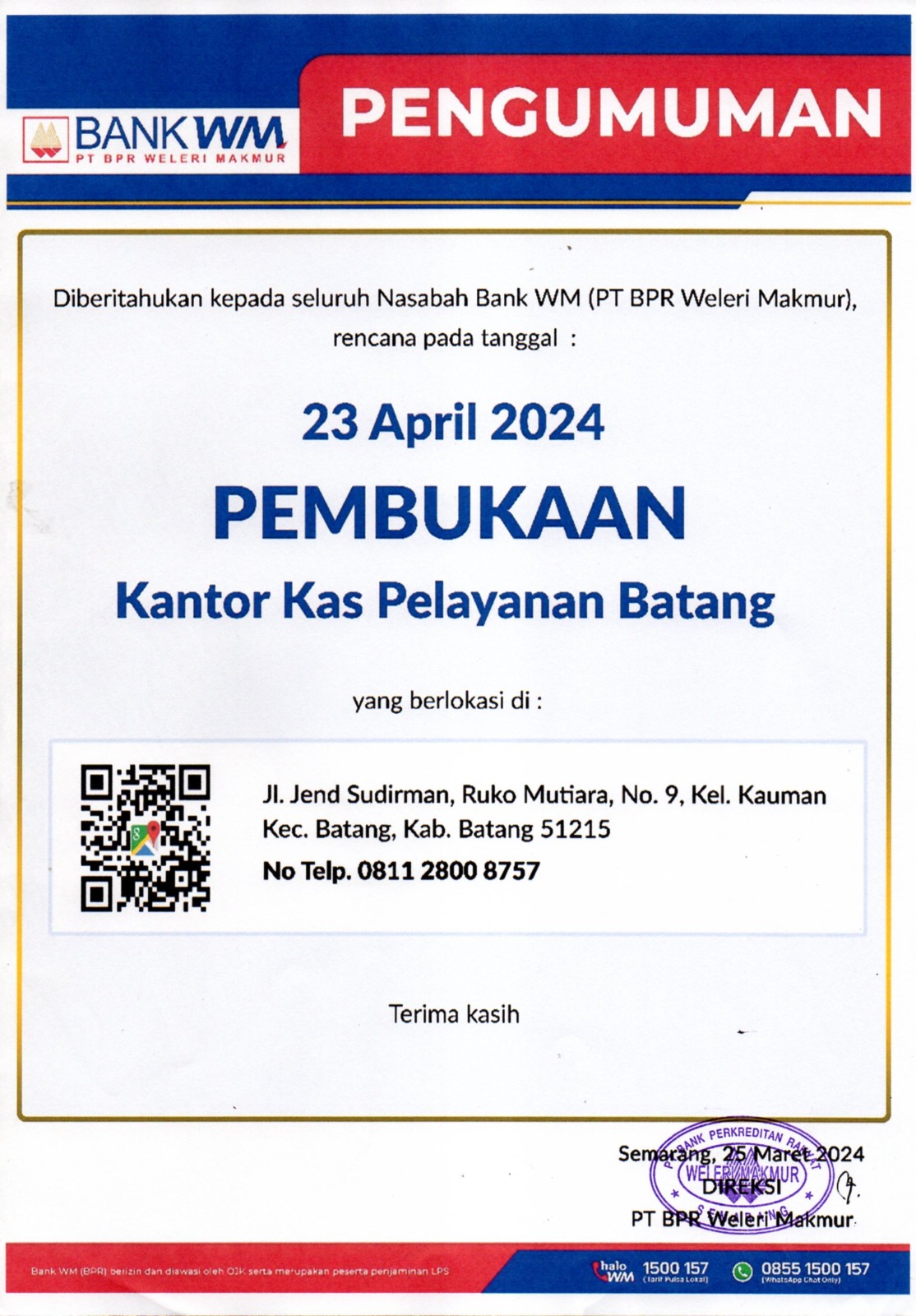 Pengumuman Pembukaan Kantor Kas Pelayanan Batang